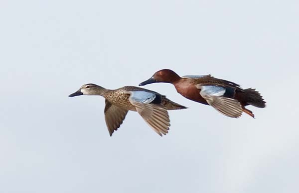 Female in front with Male Cinnamon Teal following